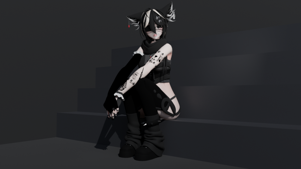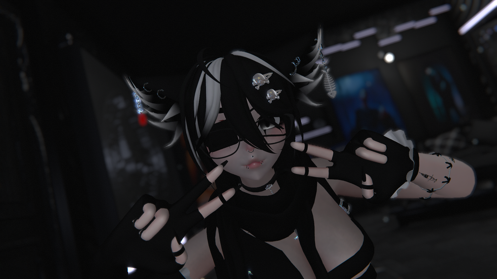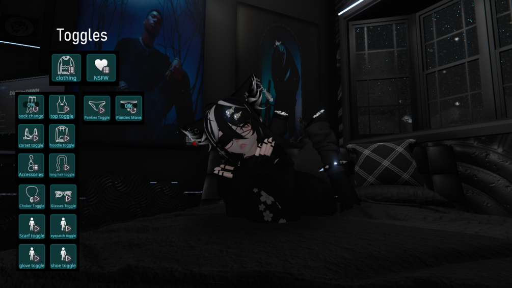 Base(v1) - ImLeXz(edited by me) // Corset and Hoodie - Vampi(edited by me) // Hair - Apyr // 3.0 Locomotion - Wetcat // 3.0 Icons - Ask Amber // Head+Face texture - cicieaaaVR (edited by me) // Ears - Nyakoh (edited by me) // By me - Choker, Body Harness, Both Thigh-highs, Panties, Toe beans/Accessories. Ingame photos - Ash.